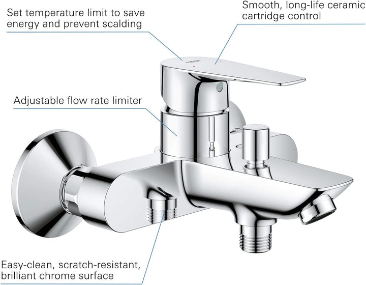 - GROHE Start Edge QuickFix Einhand-Wannen-/Duscharmatur für die Wandmontage, Metallhebel, wassersparend, Chromoberfläche. Mit GROHE QuickSpanner einfach zu installieren. 24198001