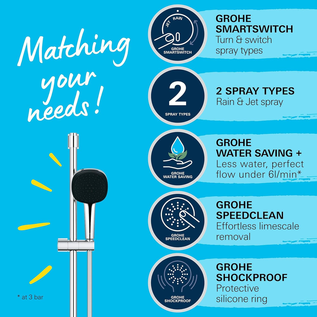 - Die GROHE Vitalio Comfort 110 Brausegarnitur mit zwei Strahlarten schont wertvolle Ressourcen und sorgt für mehr Komfort und Sicherheit.