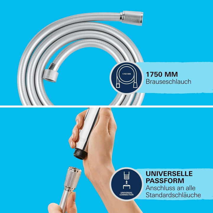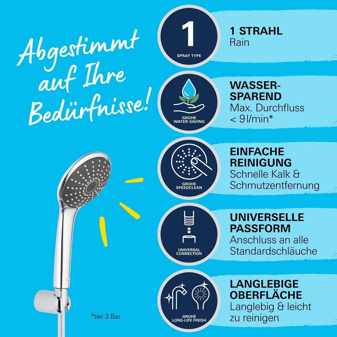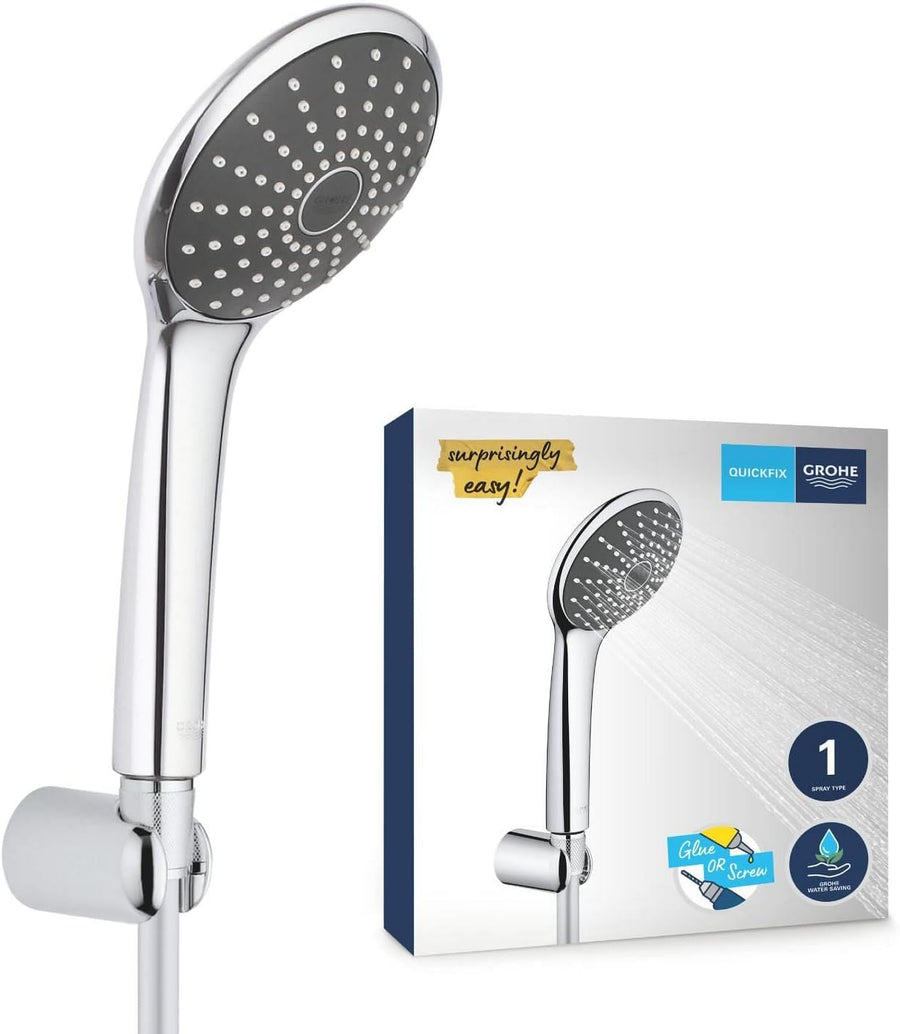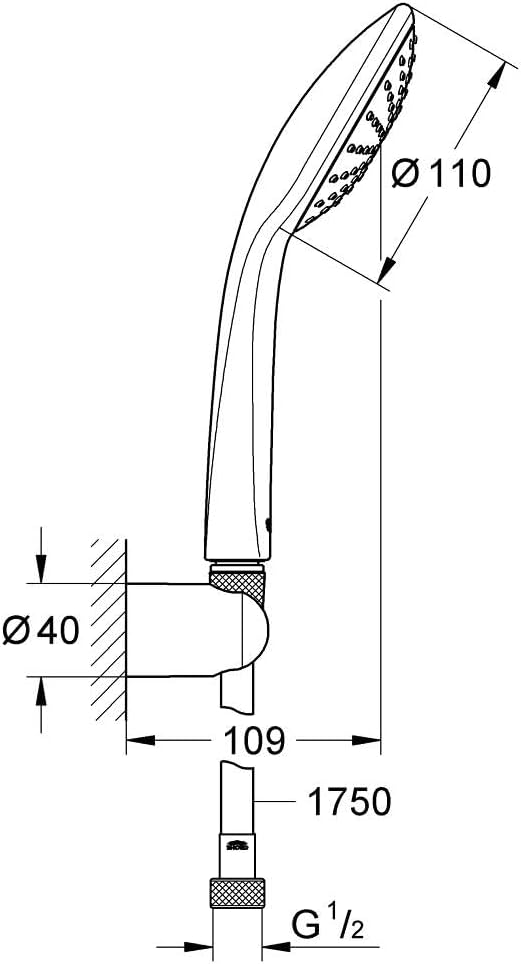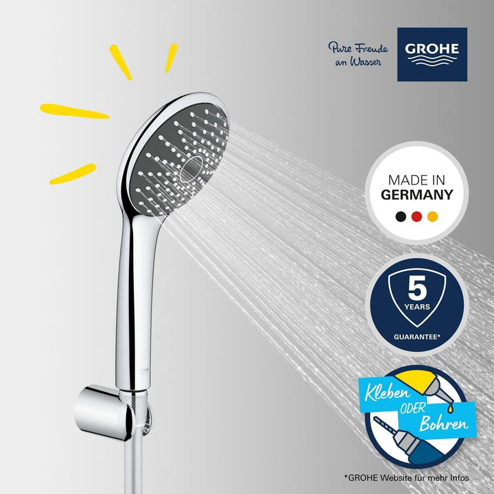 - Die „GROHE Vitalio Joy“ 110 Mono Wandhalter-Set wird mit einer Handbrause geliefert, die einen Durchmesser von 110 mm hat. Geniessen Sie das sanfte Strahlbild, ohne Wasser zu verschwenden