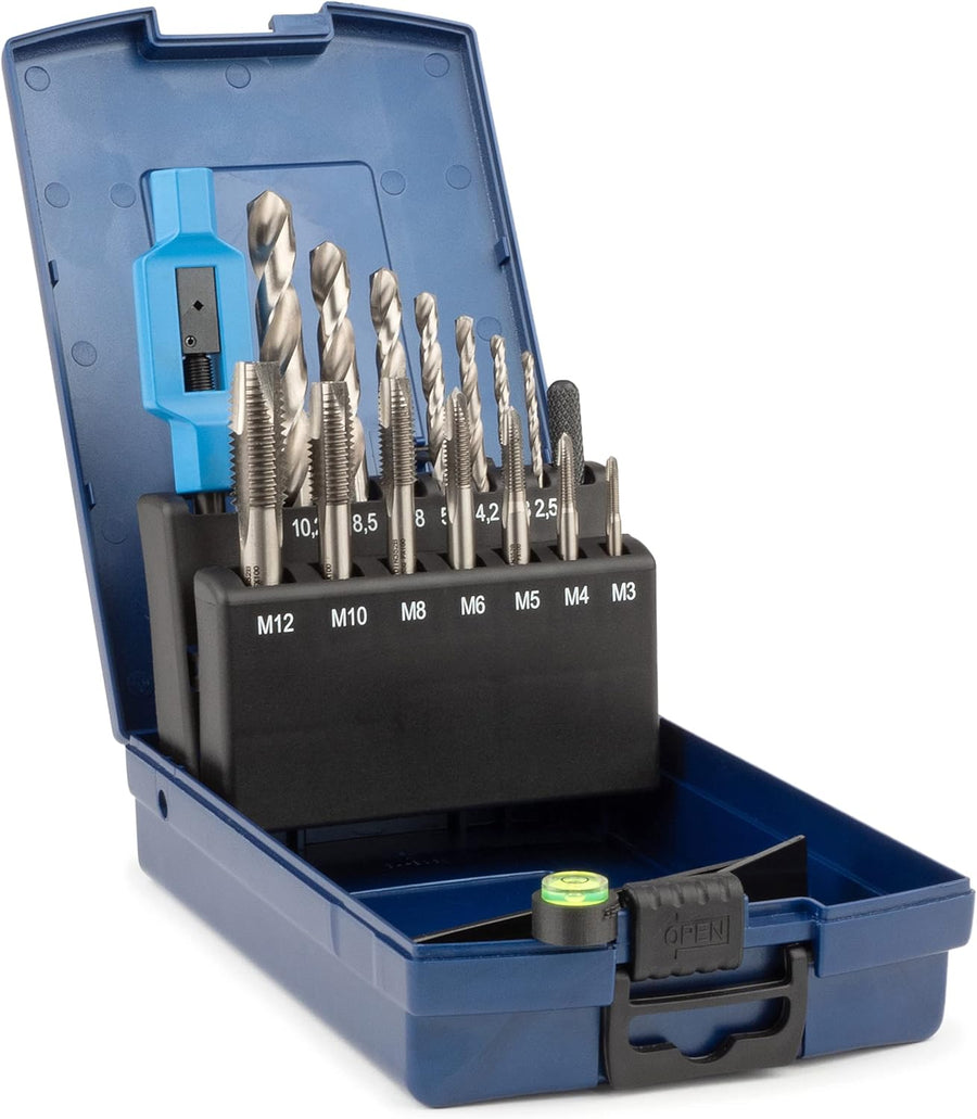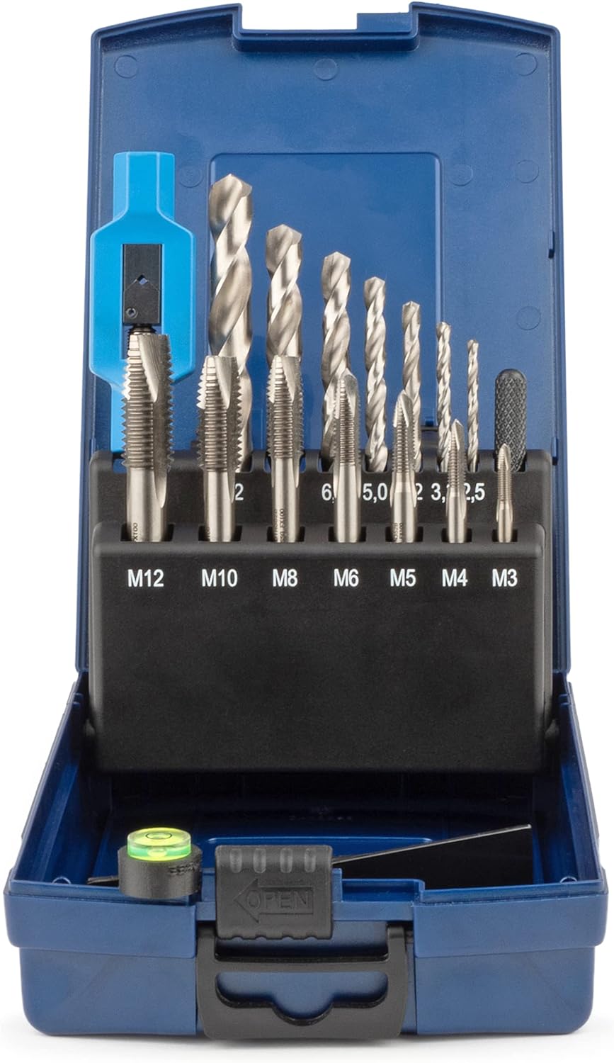 - INHALT: 7 x HSS-G Einschnittgewindebohrer (kurze Maschinengewindebohrer) DIN 2184-2(DIN 352), geschliffene Ausführung M3-M12 + 7 HSSG Kernlochspiralbohrer + 1 verstellbares Windeisen(GSR Silver) No.1 1/2 + 1 magnetisches Zentrierauge.