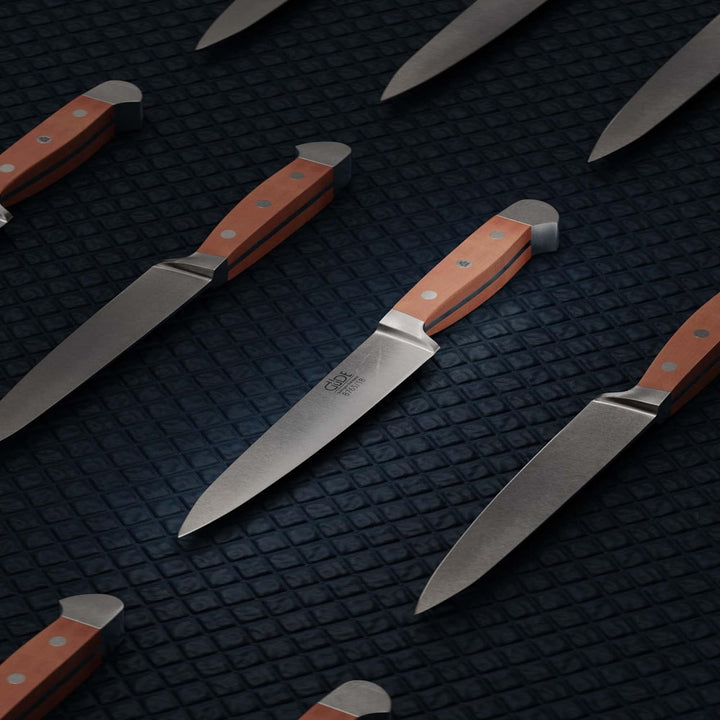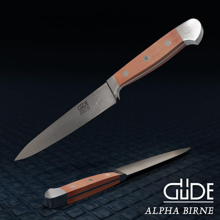- Das aus einem Stück im Gesenk geschmiedete Messer, wird in über 40 manuellen Arbeitsgängen von Hand, in ein einzigartiges Meisterstück verwandelt. Diese Leidenschaft, bestückt mit edlem Birnenholz, lassen kulinarische Herzen höher schlagen