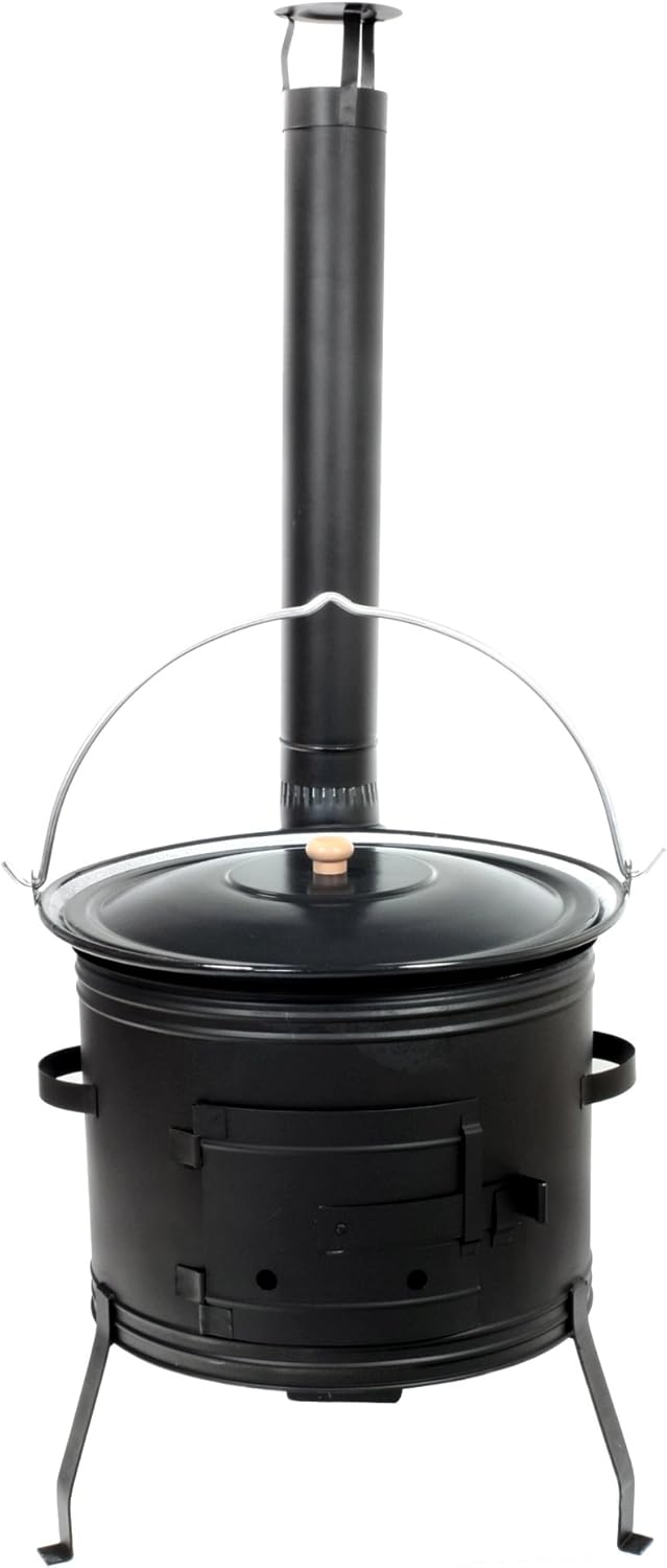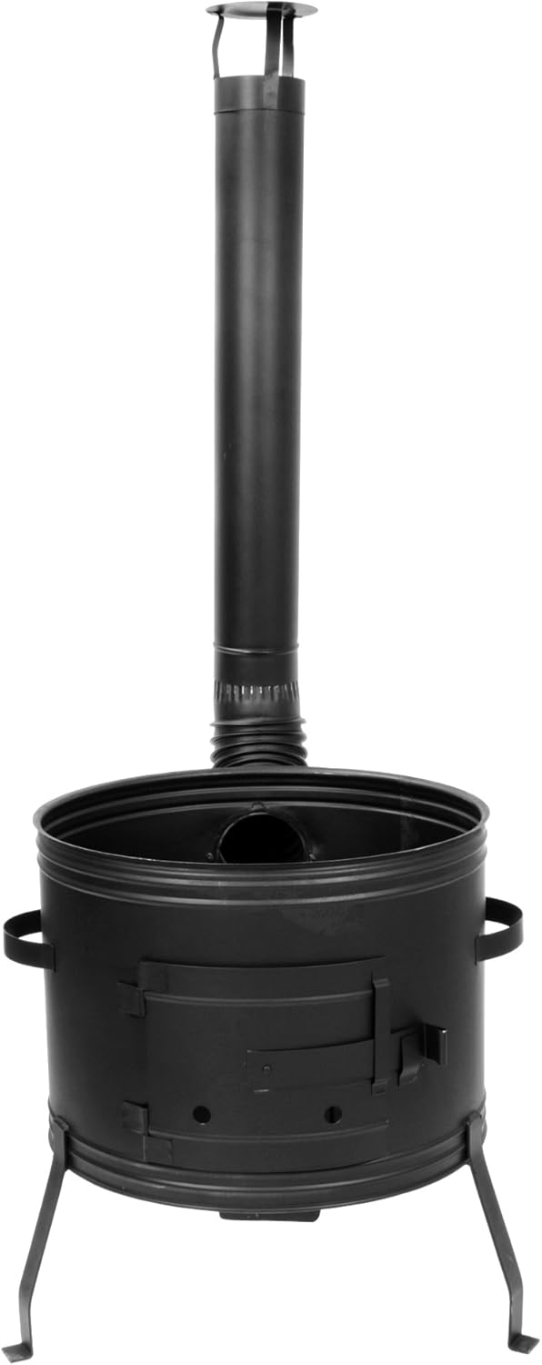 - Durchmesser der Feldküche: ca. 39 cm, optimal für eine Kesselgrösse von 15 Liter, Höhe ca. 50 cm, Kaminhöhe ca. 66 cm, Rohrdurchmesser 10 cm.