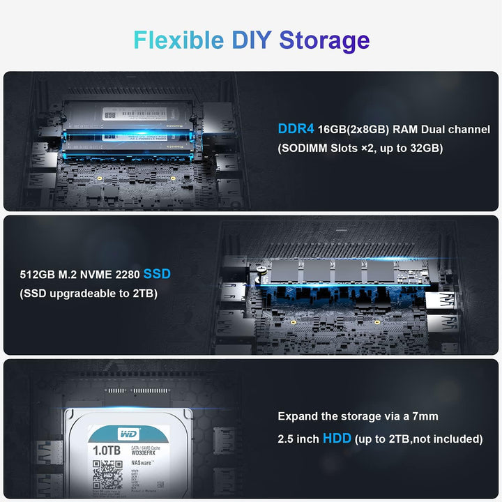 - 【Larger Memory & Expandable Storage】Built-in 8GB LPDDR4 RAM, 256GB M.2 SATA SSD (supports up to 2TB M.2 SATA3 SSD 2280/2.5" SATA3 HDD, not included). Support external hard drive expansion, DIY 2.5 inch SSD/HDD (not included) in the removable empty