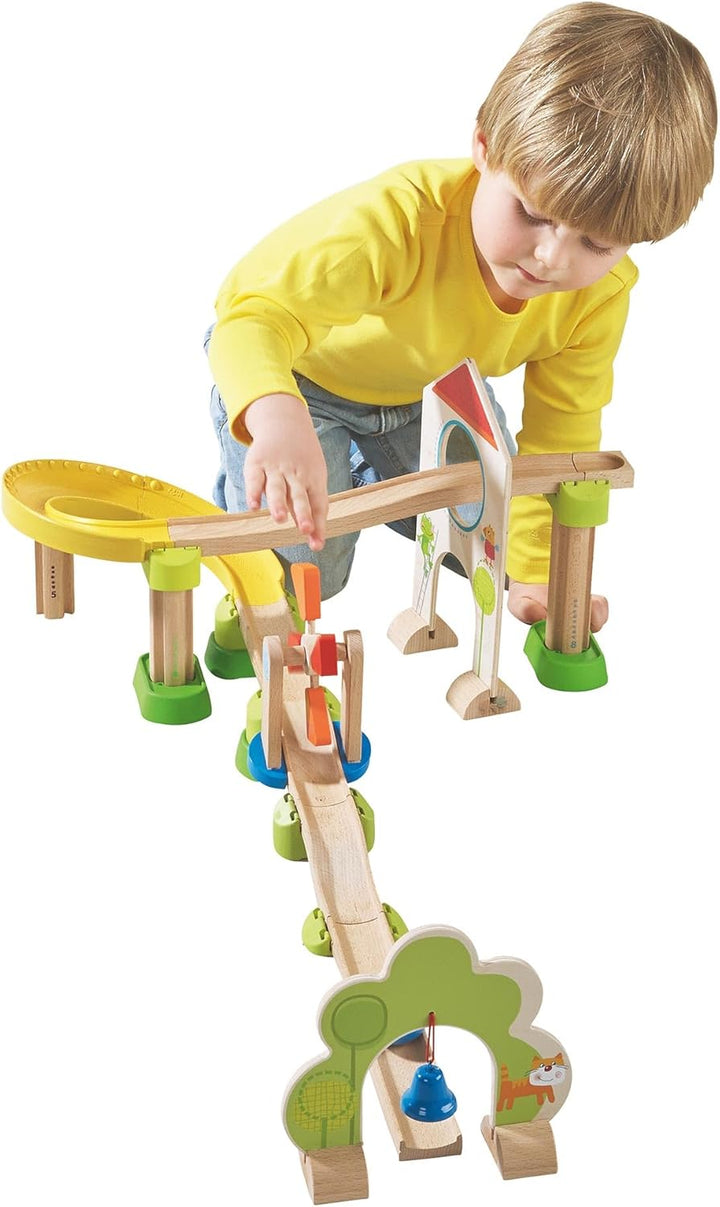 - Mit Windrad, Glöckchen-Tor und Steilkurve sorgt die Holzkugelbahn für tolle Effekte