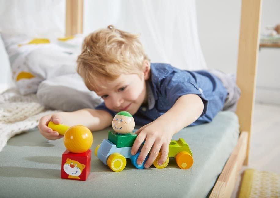 - Autos, Bausteine und Kugel laden die Kinder zum Entdecken von Farben und Formen sowie zum kreativen Bauen und Stecken ein