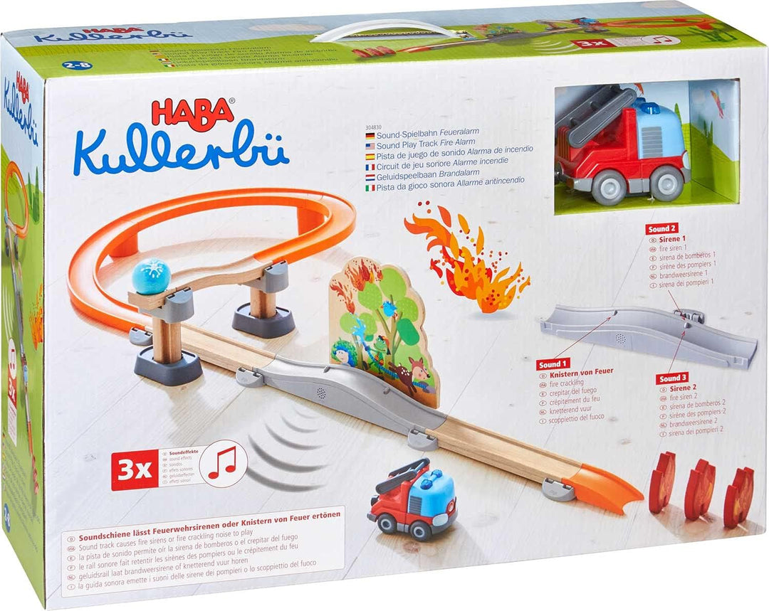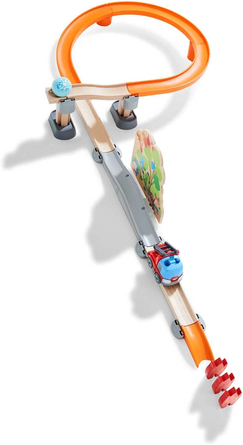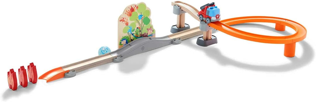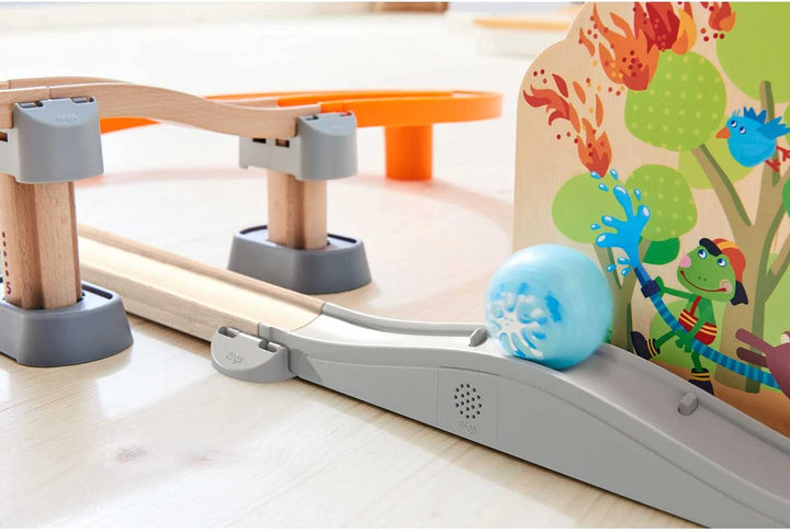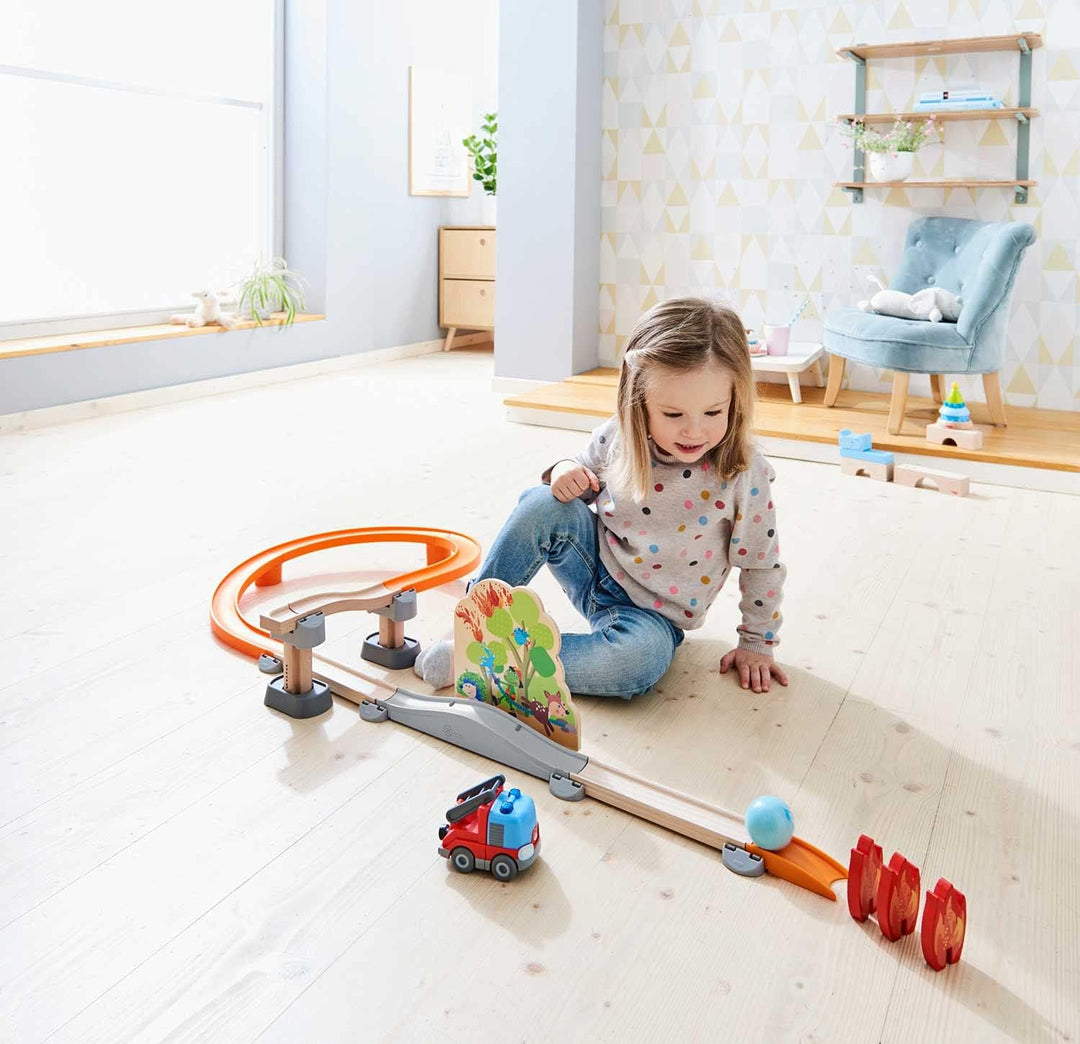 - Die Kugelbahn aus Holz sorgt mit dem Feuerwehr-Leiterwagen und der Waldbrand-Kulisse für maximalen Spiel- und Fahrspass
