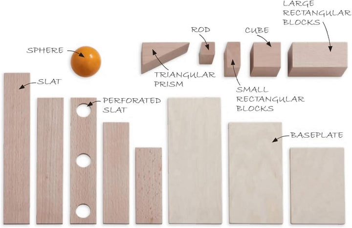 - Motorikspielzeug aus Holz mit 160 Bauteilen: Quader und Würfel in verschiedenen Grössen, Prisma, Kugeln, Leisten und Platten in unterschiedlichen Formaten