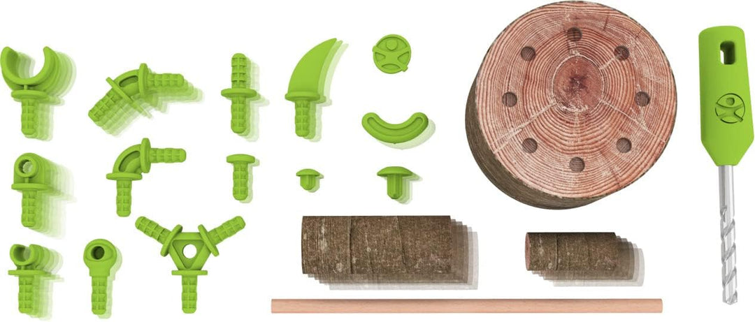 - Im Bastel-Set enthalten sind 75 Connectors, 1 Kinder-Handbohrer (Ø 6 mm), 17 Holzstücke mit Rinde, 1 Rundstab und ein Anleitungsheft