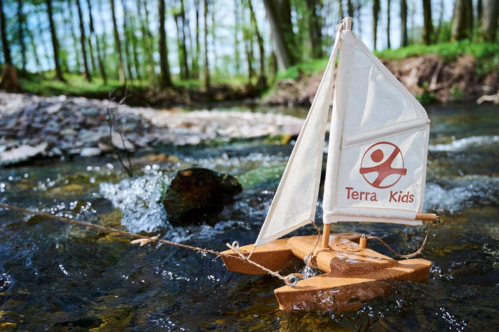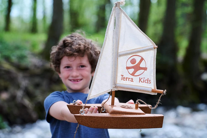 - Bootskörper und Steuerruder des Spielzeug-Katamarans bestehen aus gepresstem Korkgranulat mit optimalen Schwimmeigenschaften