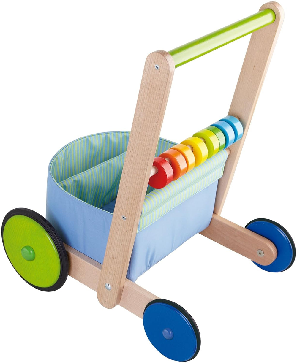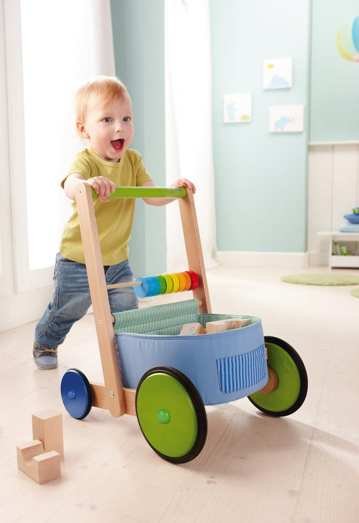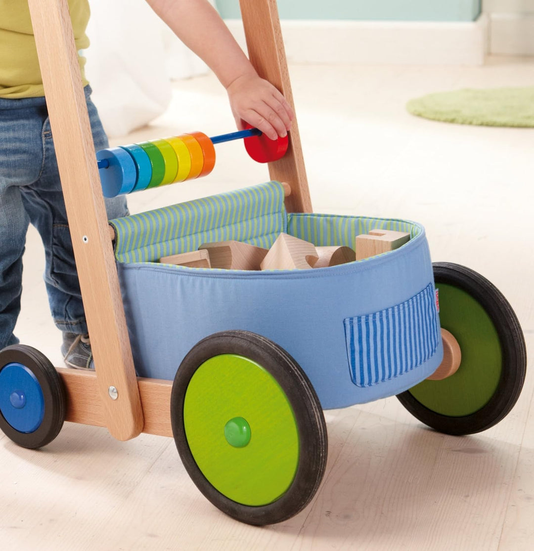 - Der hochwertige Wagen aus Holz mit individuell justierbarer Bremse regt zum Stehen und Gehen an und fördert die Feinmotorik