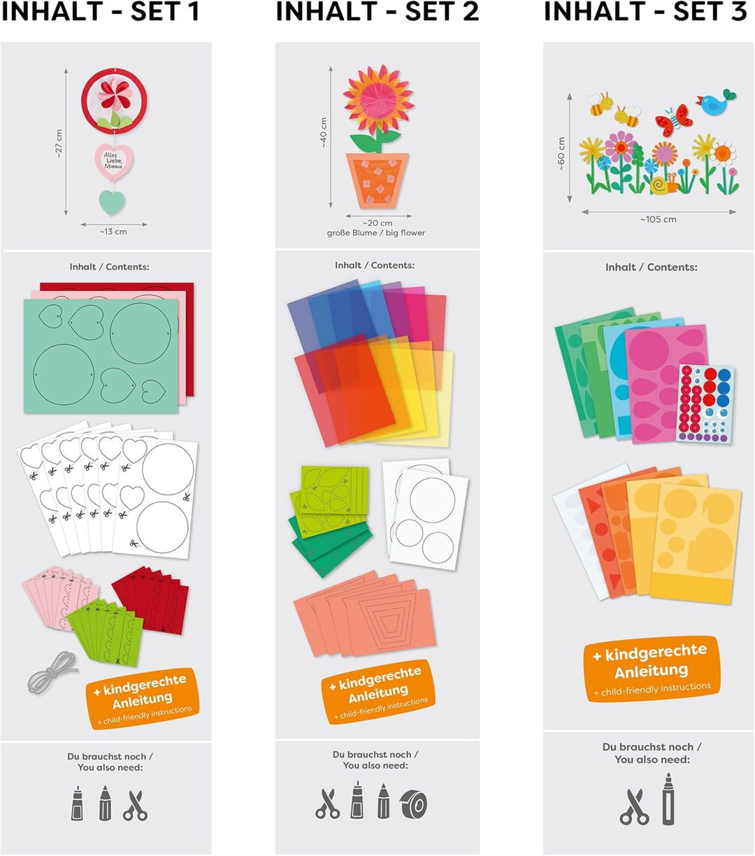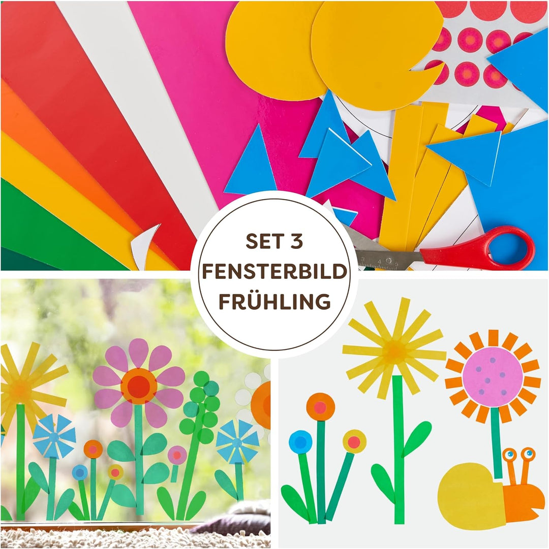 - SET 2 - FENSTERBILD BLUMENTOPF: Gestalte deinen Blumentopf: Enthält 10x Transparentpapier, 4x Fotokarton, 4x Tonkarton und 2 Kreisvorlagen. Schneiden, falten und kleben – so entstehen wunderschöne Frühlingsblumen-Fensterbilder mit bis zu 20 cm