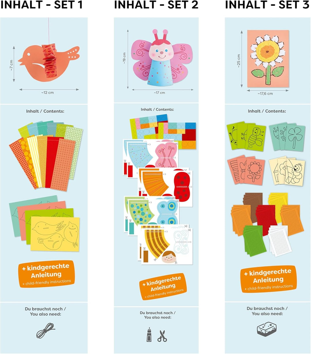 - SET 2 - ERSTES KLEBEN: Kreative Frühlingsbilder gestalten: Enthält 12x Fotokarton & 28 vorgestanzte Buntpapier Vorlagen. Einfach ausbrechen, zuschneiden, befeuchten und in die Skizzen einkleben – so entstehen bezaubernde Motive wie Vögel, Bienen,