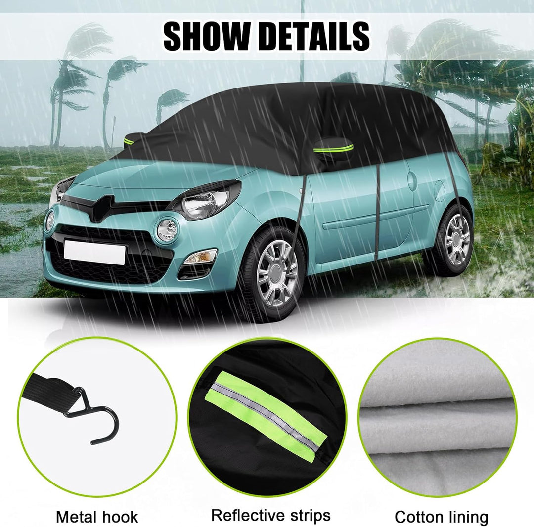- Einfache Montage: Die Autoabdeckung verfügt über 8 elastische Bänder (drei auf jeder Seite, zwei am Kofferraum) und verstellbare Metallhaken, um die Karosserie fest zu befestigen. Die Rahmen auf beiden Seiten sind mit Ohrenschützern ausgestattet, um