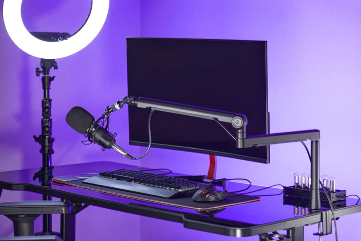 - EDLES DESIGN: Der Mikrofonhalter aus hochbeständigem, mattschwarz lackiertem Aluminium hat eine zeitlose und professionelle Optik, die auf jeden Schreibtisch passt. Integrierte Kabelkanäle sorgen dabei für einen aufgeräumten Arbeitsplatz.
