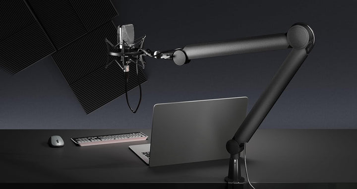 - EDLES DESIGN: Der Mikrofonhalter aus hochbeständigem, mattschwarz lackiertem Metall hat eine zeitlose und professionelle Optik, die auf jeden Schreibtisch passt. Kabelkanäle sorgen dabei für einen aufgeräumten Arbeitsplatz.