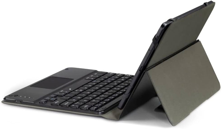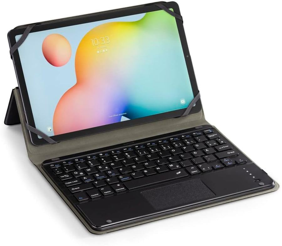 - Bedienerfreundliche Tablet-Hülle mit magnetischer Verschlusslasche: die Tastatur verfügt über Touchpad und geräuscharme Tasten, passgenaues Cover, stabiles Metall-Scharnier zum Aufstellen