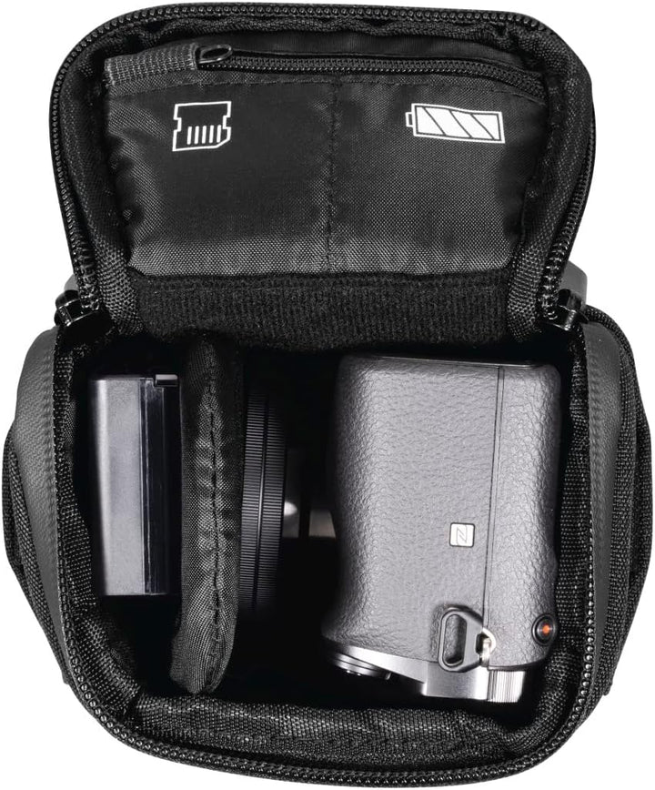 PRODUKTBESCHREIBUNGEN Hama Kameratasche "Matera" 90 (kompakte Fototasche für Gürtelschlaufe, Kameratasche für Digitalkamera und Zubehör, Umhängetasche mit Schultergurt und Zubehörfächern, recyceltes PET) schwarz Für alle, die mit ihrer Kamera gern unterwegs sind - die gepolsterte Fototasche aus strapazierfähigem Polyester schützt Ihre Kompaktkamera zuverlässig vor Schmutz und Feuchtigkeit. Batterien und Speicherkarten finden Platz in den Taschen unter dem Deckel, weitere Kleinigkeiten können im vorderen Reissverschlussfach oder in den beiden Seitentaschen untergebracht werden. Klein, handlich und super für unterwegs: Die Kameratasche bietet verschiedene Tragemöglichkeiten: Mit der Gürtelschlaufe lässt sie sich wie eine Bauchtasche tragen oder mit dem Tragegurt einfach über die Schulter hängen. Dieser kann mittels Karabiner bei Bedarf abgenommen werden. Der gepolsterte Tragegriff ermöglicht ebenso ein bequemes Tragen in der Hand. Über den Doppelreissverschluss kommt man schnell ins Hauptfach und damit an die Kamera heran. Der Innenbereich kann durch den verstellbaren Inneneinteiler individuell unterteilt werden, so dass neben der Kamera auch weiteres Zubehör, wie z. B. ein Objektiv, Platz findet. Durch das kompakte Design und das geringe Gewicht von 225 Gramm ist die Tasche der optimale Reisebegleiter. Dabei ist sie nicht nur praktisch, sondern auch besonders ressourcenschonend hergestellt, denn sie besteht aus recyceltem Polyester. Technische Details Farbe: Schwarz Farbton: Schwarz Produktbereich: Foto & Video Serie: Matera Ausführung: Softcase Ausstattung: Gürtelschlaufe/Verstellbarer Schultergurt Material: Recycled Polyester (R-PET) Gewicht: 225 g Grössencode: 90 Innenmass B x T x H: 8 x 7,5 x 13 cm Geeignet für: Foto Verwendungszweck: Foto