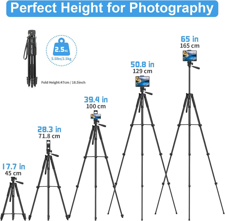 - 【65" Stativ für iPhone/iPad/Kamera/Gopro/Ringlicht】: 1/4 "Schnellfreigabeplatte, kompatibel mit den meisten Smartphones, Tablets, Mini -Ringlichtern, gewöhnlichen leichten Kameras und Sportkamera). Schnellflip -Lock ist super einfach zu Sperren und