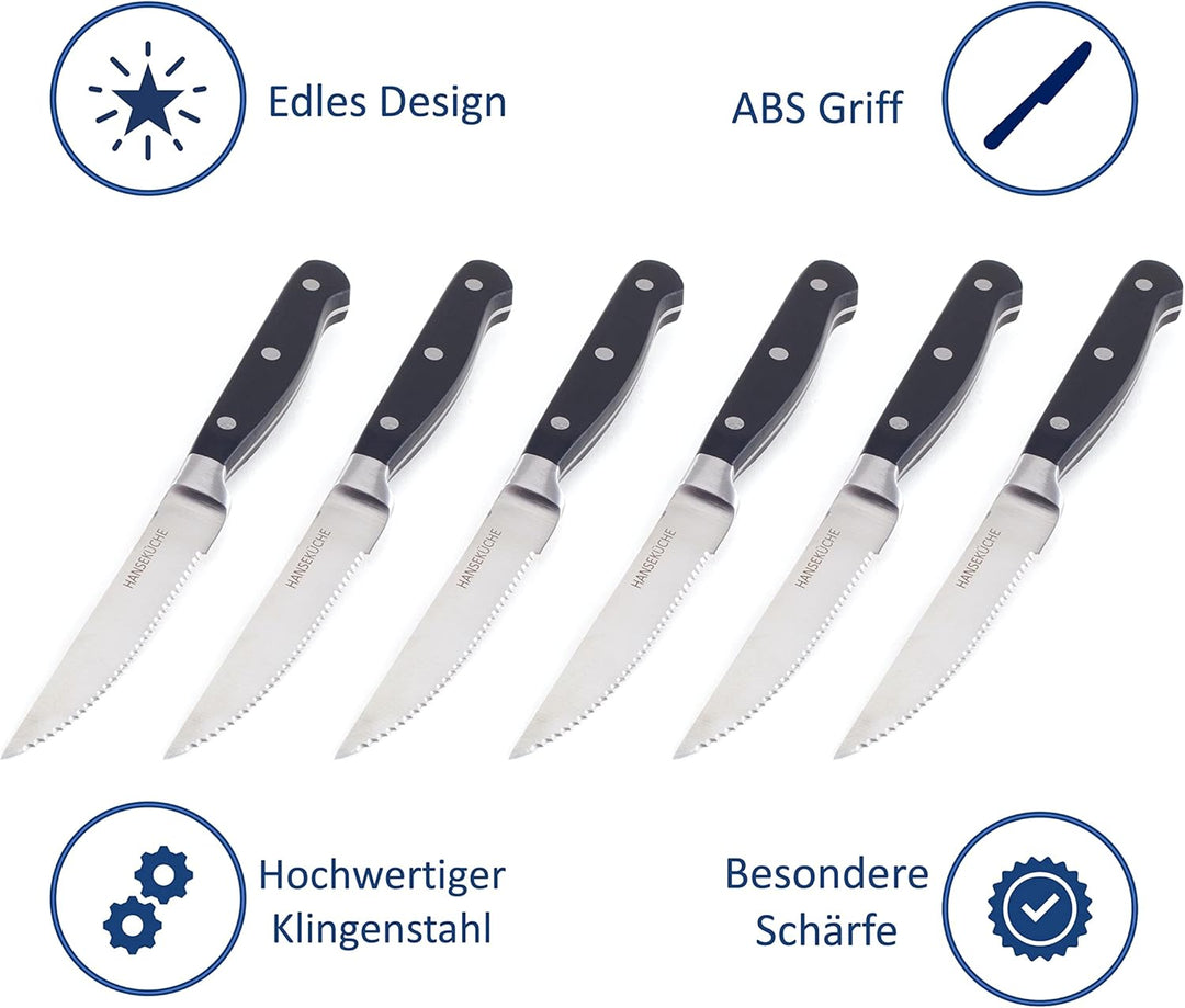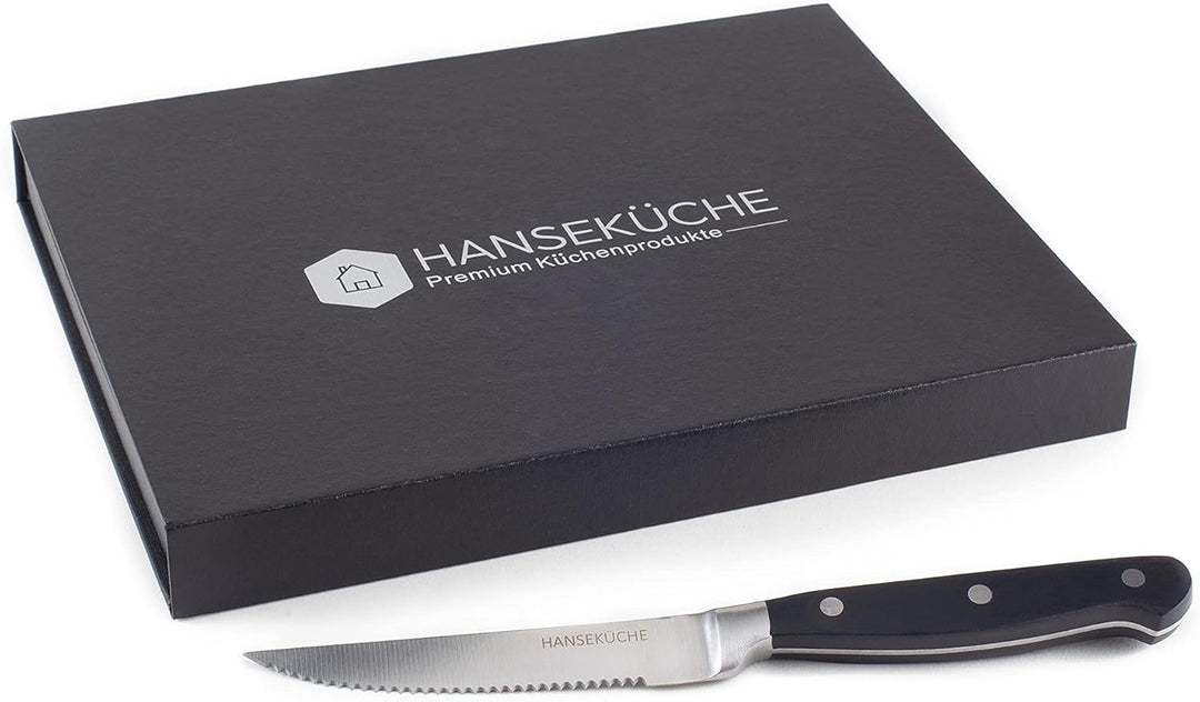 - ✅ EDLE AUFBEWAHRUNGSBOX – Nach dem Gebrauch finden die Steakmesser Platz in unserer edlen Aufbewahrungsbox, die auch als Geschenkbox genutzt werden kann. Insgesamt umfasst das Hanseküche Steakmesser Set sechs Steakmesser und eine Aufbewahrungs- bzw.