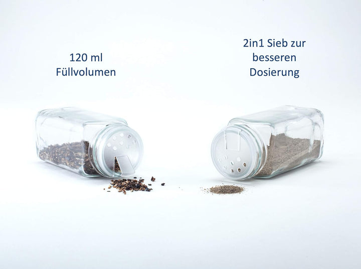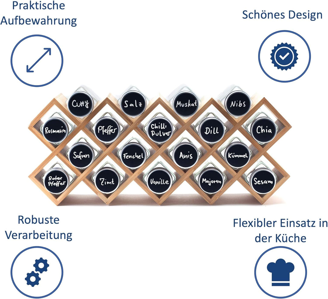 - ✅ PRAKTISCHE AUFBEWAHRUNG MIT 18 GEWÜRZGLÄSERN – Mit dem Gewürzregal von Hanseküche stehen Ihre wichtigsten Gewürze immer griffbereit. Neben dem Gewürzständer erhalten Sie 18 Gewürzgläser (jedes Glas hat 120 ml Fassungsvermögen) mit einer kleinen und grossen Streuöffnung zur optimalen Dosierung, 25 Etiketten und einem Marker. Dadurch schaffen Sie Übersicht in Ihrer Küche und können Ihre unterschiedlichen Gewürze einfach und flexibel einordnen.