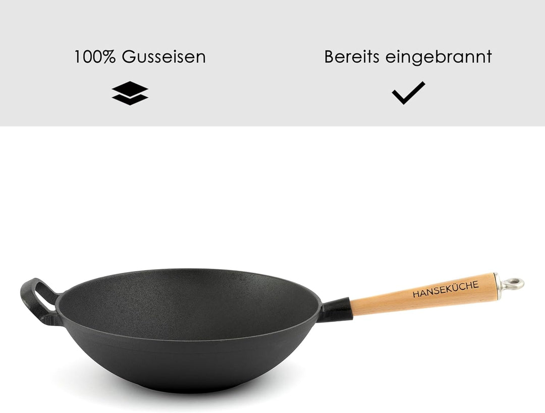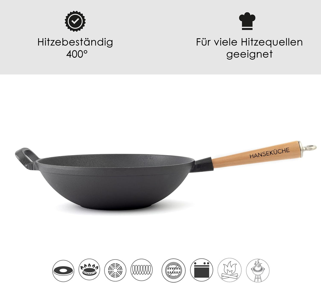 - ✅ OPTIMALE TEMPERATURBESTÄNDIGKEIT- Hergestellt aus emailliertem Gusseisen wird die Wärme optimal gespeichert und an das Gericht im Wok weitergegeben. Der Hanseküche Wok ist temperaturbeständig bis 400 Grad.