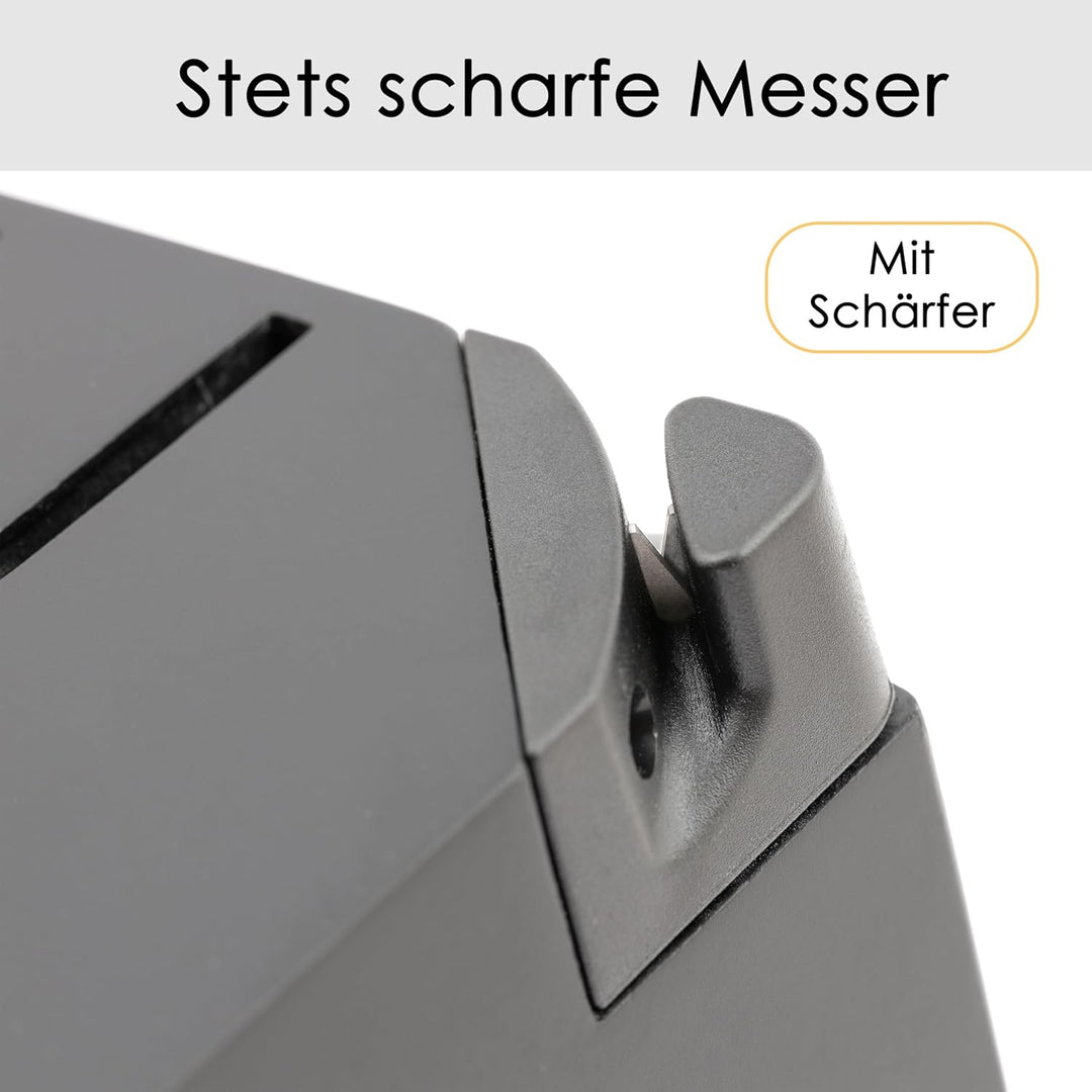 - ✅ Integrierter Messerschärfer: Der Messerblock verfügt über einen eingebauten Messerschärfer, der dafür sorgt, dass Ihre Messer immer scharf und einsatzbereit sind.