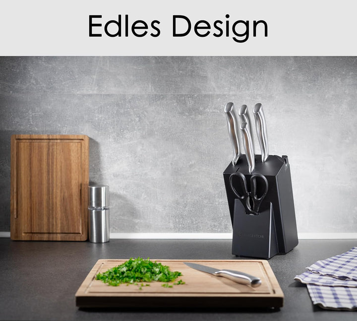 - ✅ Stilvolles Design: Der schwarze Messerblock aus Kautschukholz mit integriertem Schärfer fügt sich nahtlos in jede moderne Küche ein und bietet gleichzeitig eine sichere und platzsparende Aufbewahrung.