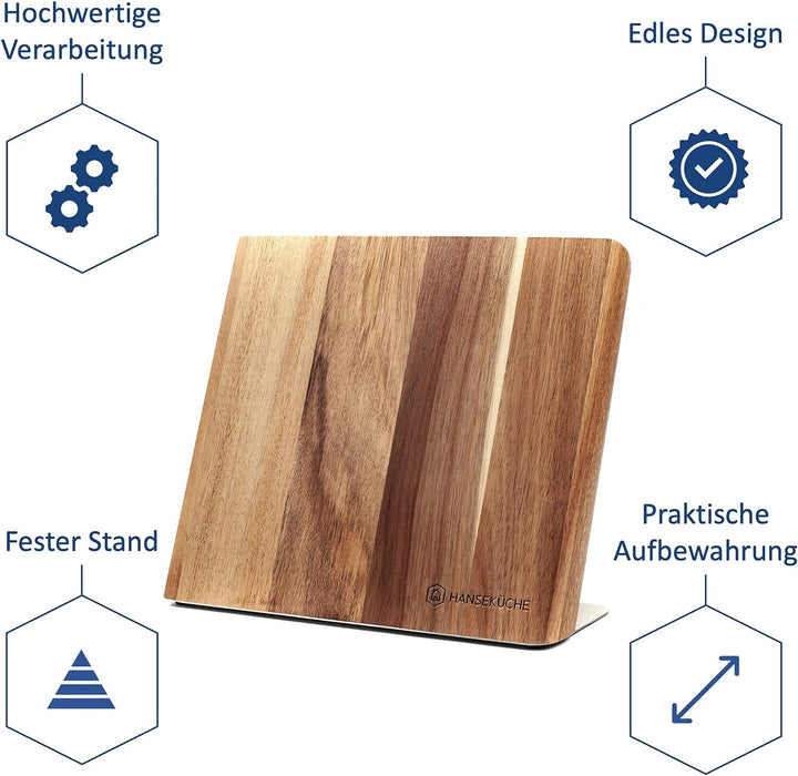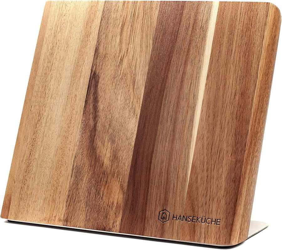 - ✅ SEHR HOCHWERTIG – Der Hanseküche Messerhalter ist aus hochwertigen Materialien gefertigt. Insbesondere die Verbindung von edlem Akazienholz und dem Standfuss aus Edelstahl sorgen für eine schöne Kombination in Ihrer Küche. Dank des integrierten und starken Magneten können Sie Ihre Küchenmesser griffbereit aufbewahren.