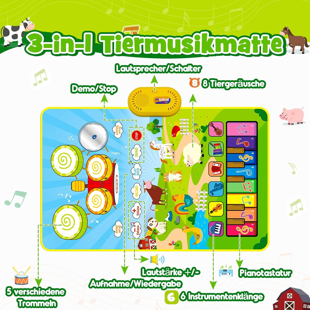 - ✨Trommeln / Klavier / Musikinstrumente 3-in-1: Klavierseite mit 8 Klaviertasten und 6 Instrumentenklängen (Klavier, Geige, Trompete, Akkordeon, Vibraphon, Gitarre) und 8 Tiertasten (Katze, Hund, Ente, Vogel, Kuh, Schaf, Pferd, Huhn). Es gibt 5