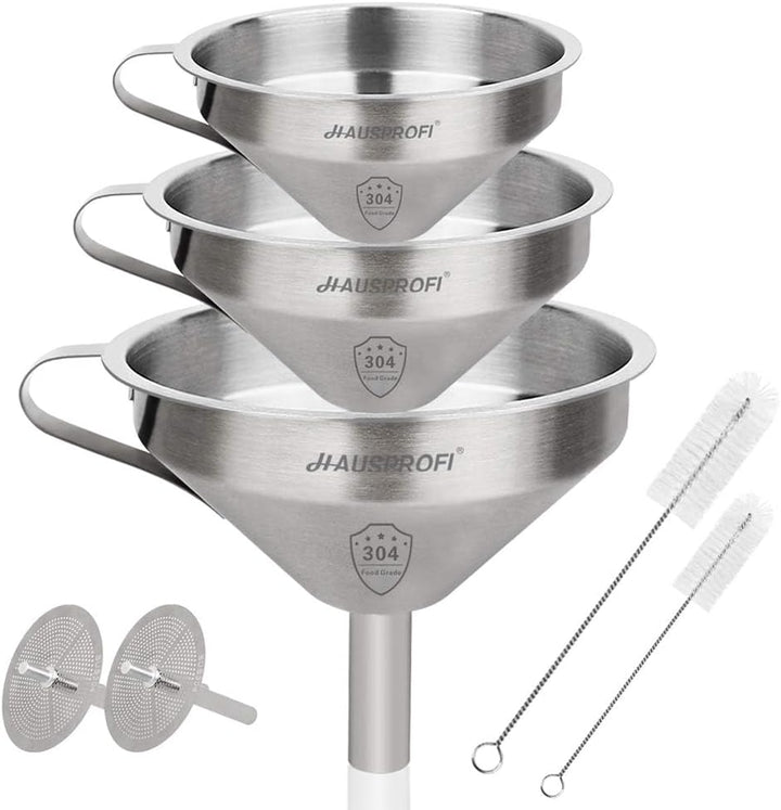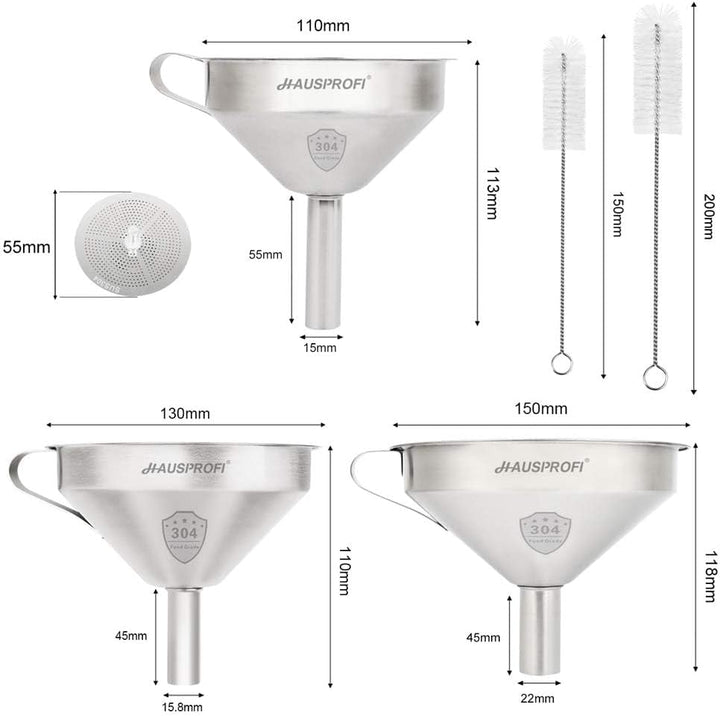 - 3 GRÖssEN, 2 SIEB: Ein Satz von 3 Stück Trichtern enthält Durchmesser von der Münder 11cm, 13cm und 15cm für Ihr verschiedene Bedürfnisse.