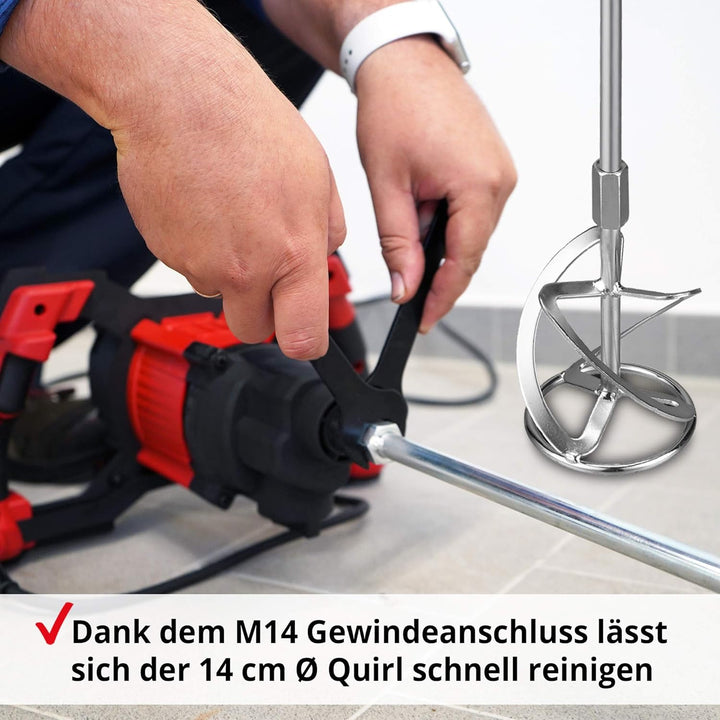 • SCHNELL SAUBER: Der 59 cm lange Quirl/Rührstab mit 14 cm Ø lässt sich dank M14 Standardanschluss schnell wechseln oder zur Reinigung abnehmen. Optimal geeignet für die Baustelle und Fliesenleger