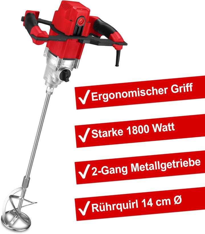• KRAFTVOLL: Starke 1800 Watt Leistung und stufenloser Regulierung der Rührgeschwindigkeit ermöglicht ein sauberes und spritzarmes Rühren. Jetzt kaufen und mit Spass bei der Arbeit Materialien mischen