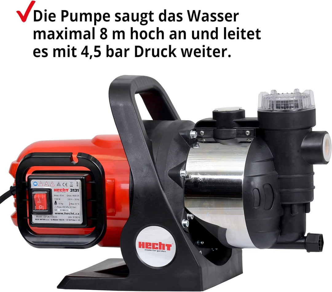 - LEISTUNGSSTARK – Die elektrische Pumpe sorgt mit 1100 Watt/4,5 bar für 4600 l/h Förderleistung. Die Förderhöhe beträgt 45 m bei einer Ansaughöhe von max 8 m. Für gleichbleibenden Wasserdruck in der Leitung