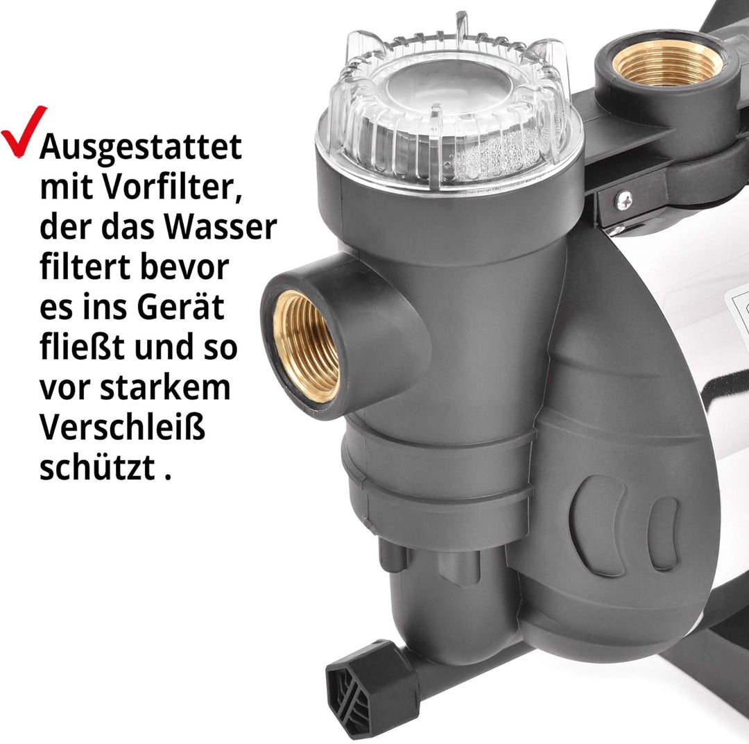 - TOP AUSGESTATTET – Die Saugpumpe ist technisch auf dem neusten Stand. Inkl. Vorfilter, Saug- & Druckanschluss mit Messinggewinde, robuster Standfuss. (Brunnenpumpe, Gartenpumpen, Wasserpumpen)