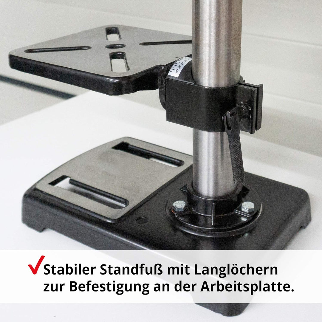 • STABIL – Die Säulen Konstruktion sorgt für den sicheren Stand der Bohrma-schine/Standbohrer. Der Ständer/Bohrständer ist mit Langlöchern versehen für die Befestigung an einem Schraubstock