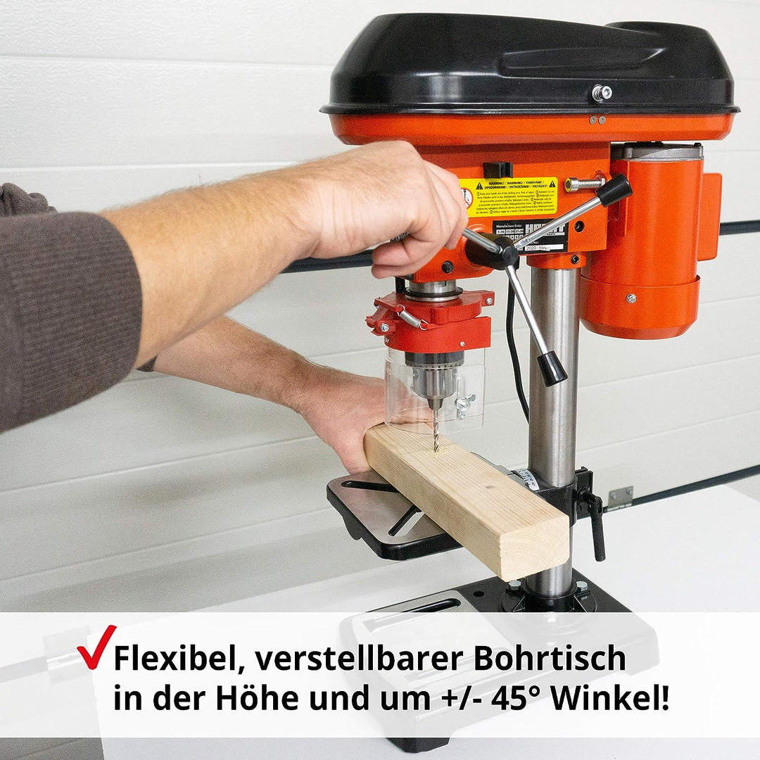 • HÖHENVERSTELLBAR – Der um +/- 45° im Winkel verstellbare Tisch bietet eine Vielzahl an Profi Bohrungsmöglichkeiten. Zudem ist die Bohrtischhöhe der Standbohrmaschine stufenlos verstellbar