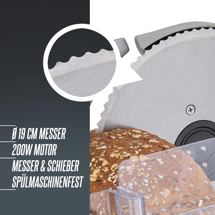 - 💪 LEISTUNGSSTARK- Ein kraftvoller 200W Motor und das Ø19cm scharfe Edelstahl-Rundmesser sorgen für einen gleichmässigen und scharfen Schnitt. Übrigens können Sie dank der stufenlos einstellbaren Schnittstärke von 0-15mm die Scheibendicke Ihren