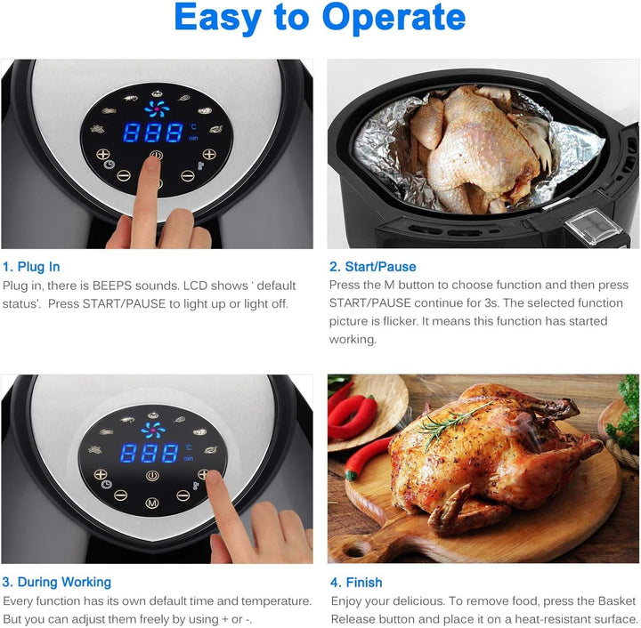 - Intelligenter: 7 Funktionsprogramme von Heissluftfritteuse ohne öl zu wählen. Es enthält Kartoffelchips, Hühnchen, Kuchen, Fisch, Steak, Garnelen, Fleisch. Berühren Sie einfach + oder -, um die Zeit(1 - 60 Minuten) und Temperatursteuerung(zw. 80 und 200 °C) einzustellen