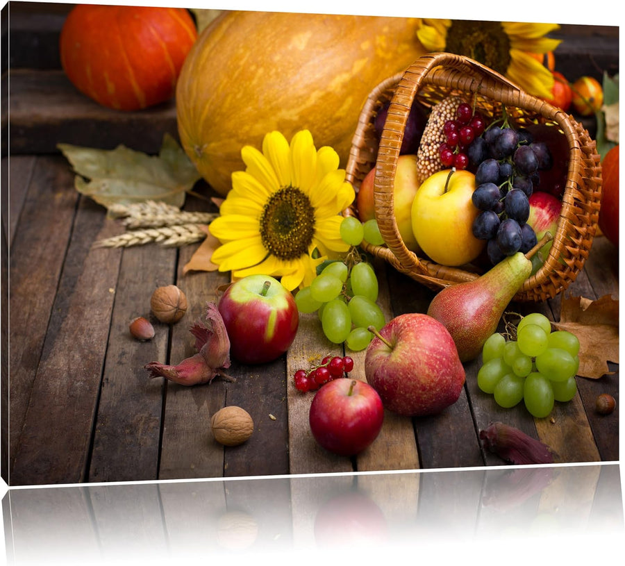 Herbstlicher Obstkorb, Format: 100x70 auf Leinwand, XXL riesige Bilder fertig gerahmt mit Keilrahmen