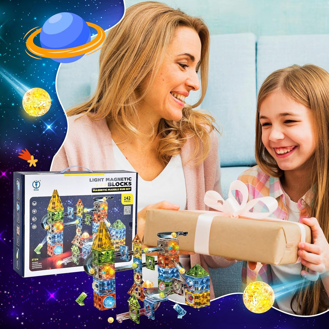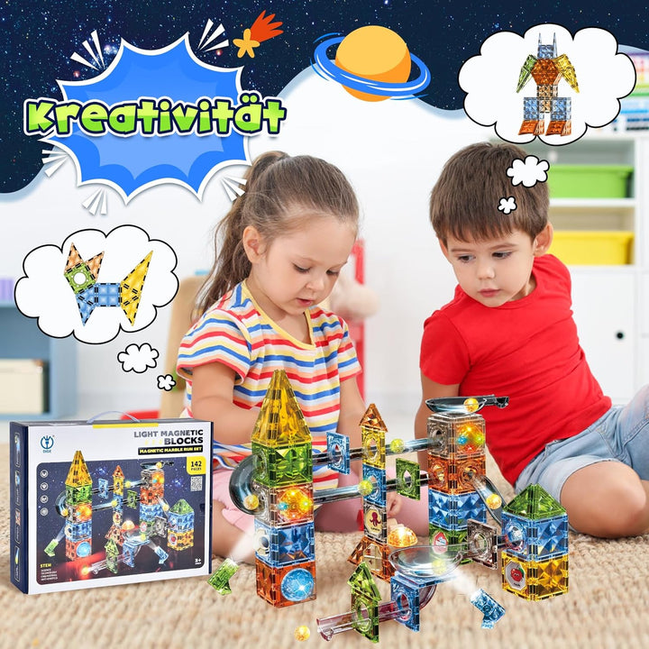• Leuchtet Magnet Stacking Spielzeug: 142 Teile Magnetische Bauklötze Set hat reiche kreative Elemente. 3D Magnet Murmelbahn Bausteine, bunte Kugeln, beleuchtete Kugeln, magnatiles und viereckigen diamantförmigen magnetischen Bausteinen, magnet Lichtern