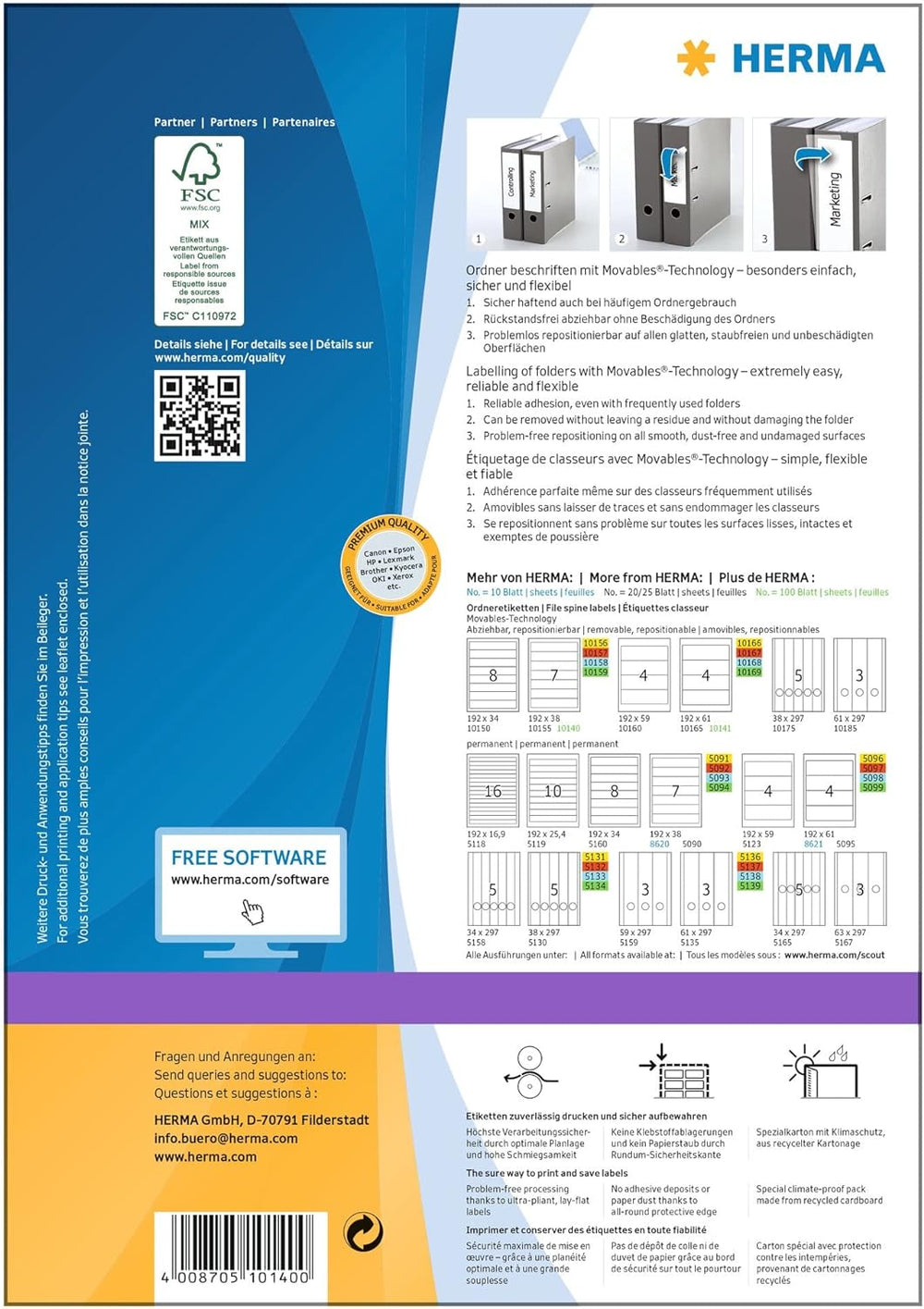 - Lieferumfang: 700 x HERMA Ablösbare Ordneretiketten, DIN A4 Format, 19,2 x 3,8 cm, rechteckig, weiss (100 Blatt je 7 Etiketten)
