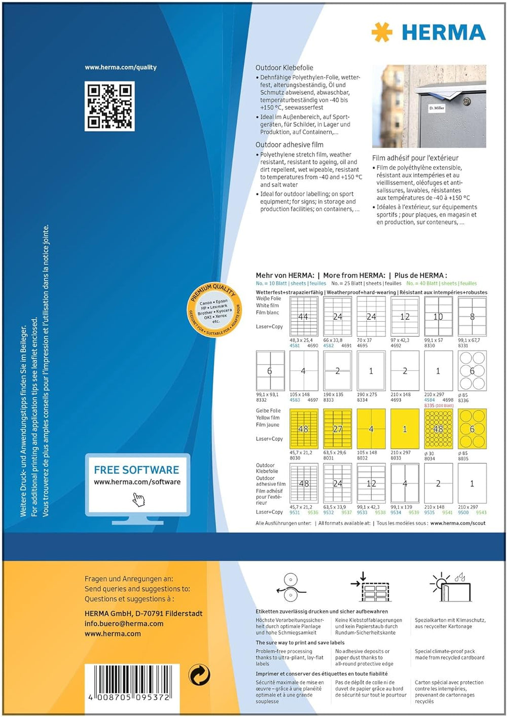 - Lieferumfang: 960 x HERMA Wetterfeste Outdoor-Folienetiketten, DIN A4 Format, 6,35 x 3,39 cm, rechteckig, weiss (40 Blatt je 24 Etiketten)