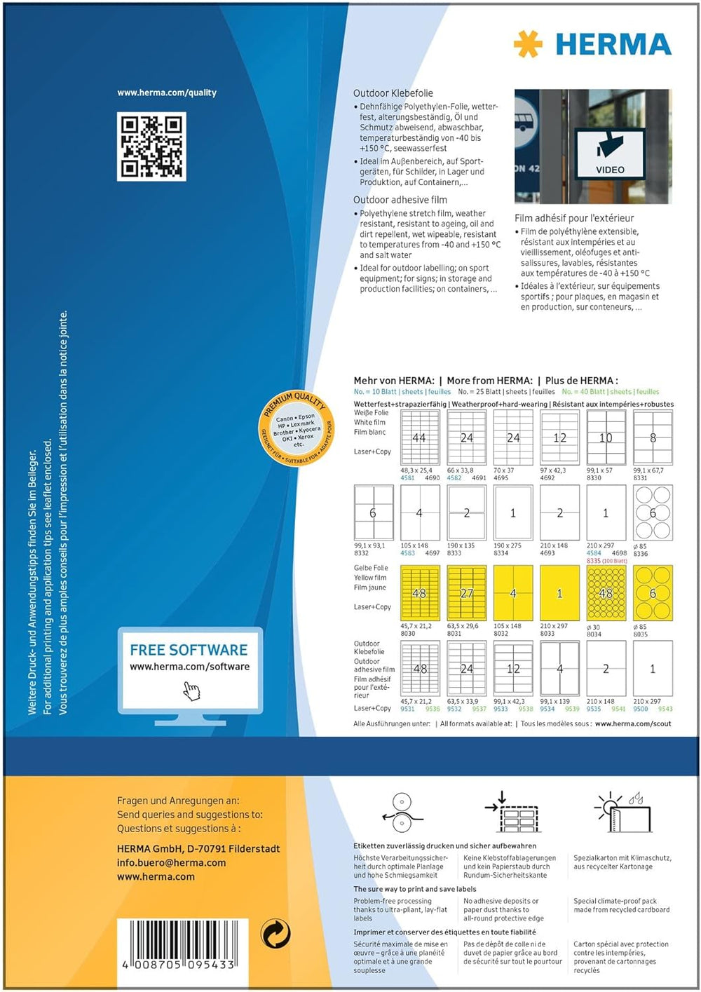 - Lieferumfang: 40 x HERMA Wetterfeste Outdoor-Folienetiketten, DIN A4 Format, 21 x 29,7 cm, rechteckig, weiss (40 Blatt je 1 Etikett)