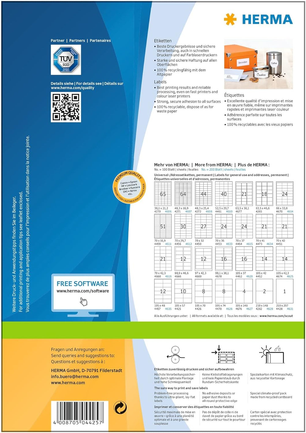 - Lieferumfang: 12000 x HERMA PREMIUM Etiketten, DIN A4 Format, 7 x 3,6 cm, rechteckig, weiss (500 Blatt je 24 Etiketten)