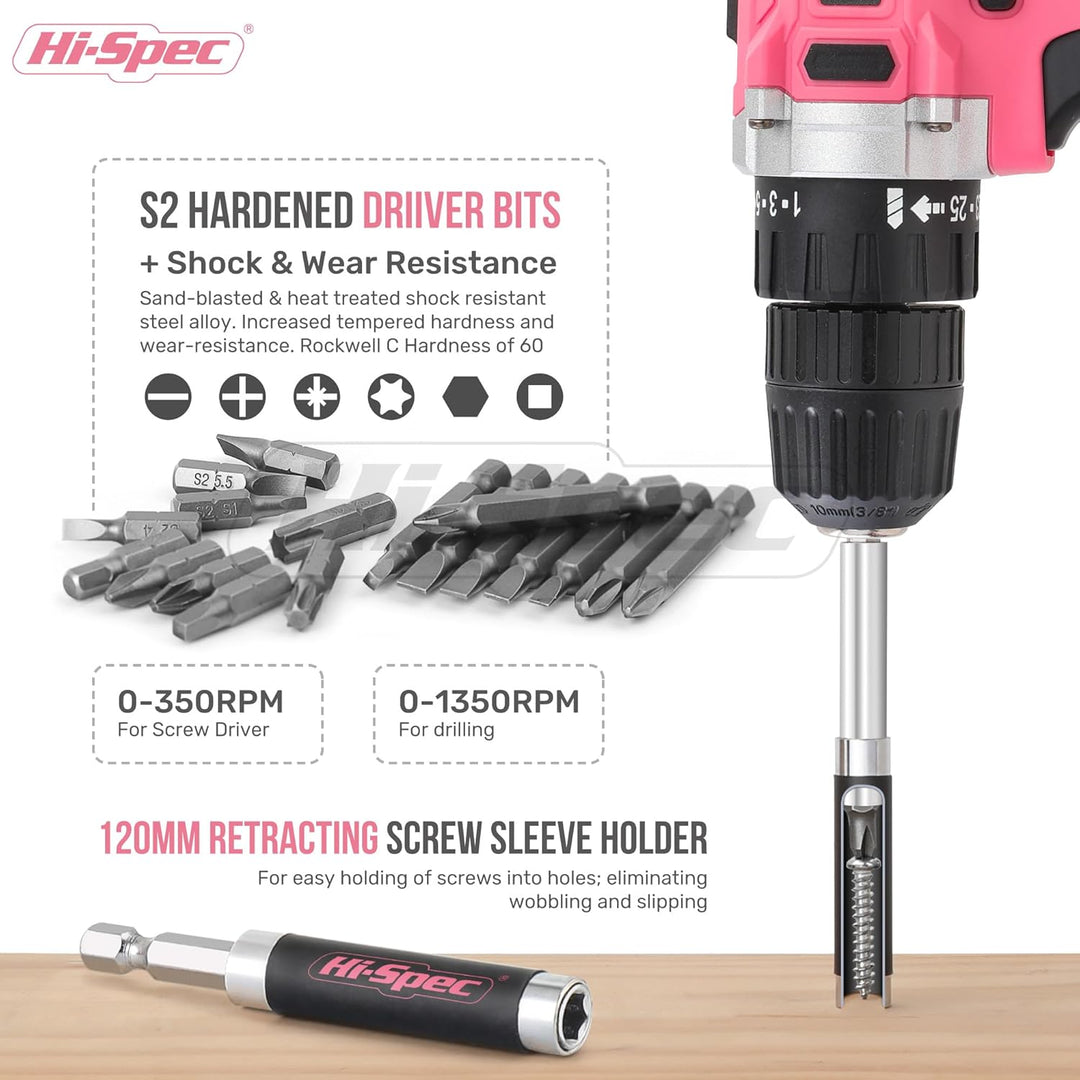 Hi-Spec 58-tlg. 18V-Akkubohrer in Pink Rosa mit S2 Bit Satz. DIY Akkuschrauber, Bohrmaschine für Met