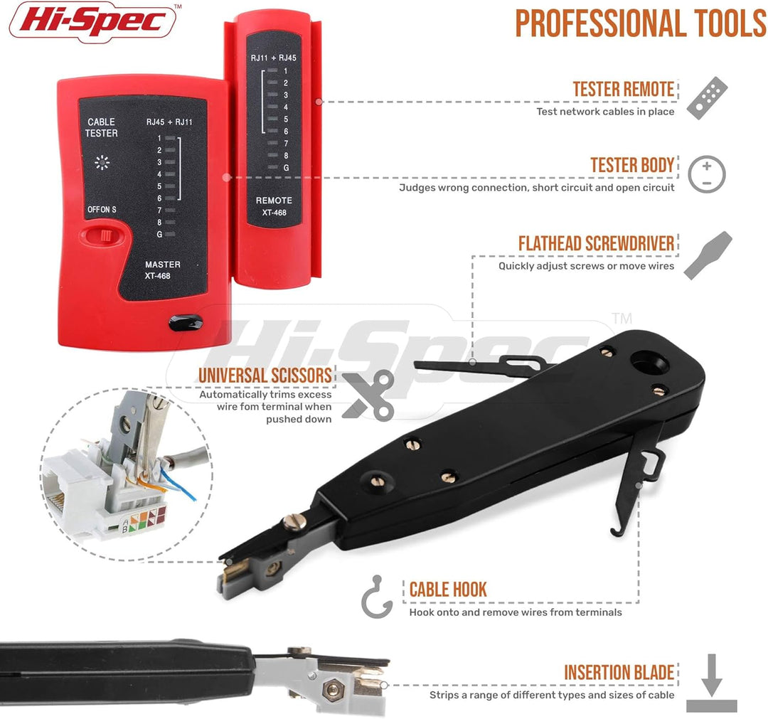 - ALLUMFASSENDES NETZWERK WERKZEUGSET: Ermöglicht dem Profi-Installateur und Begeisterten, alle Kabelabschluss- und Problembehebungsarbeiten mit Leichtigkeit durchzuführen. Vom Crimpen bis zum Schneiden mit dem Crimpwerkzeug und Kabelabisolierer, bis zum