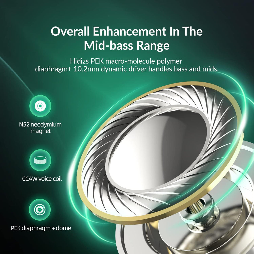 - ♫【Gesamtverbesserung im Mid-Bass-Bereich】Hidizs PEK Makro-Molekül-Polymer-Membran + 10,2 mm dynamische Treiber für Bass und Mitte. Der Bass grabt tiefer mit hervorragender Geschwindigkeit, einem engen Ansprechverhalten und ist punchierer. Die