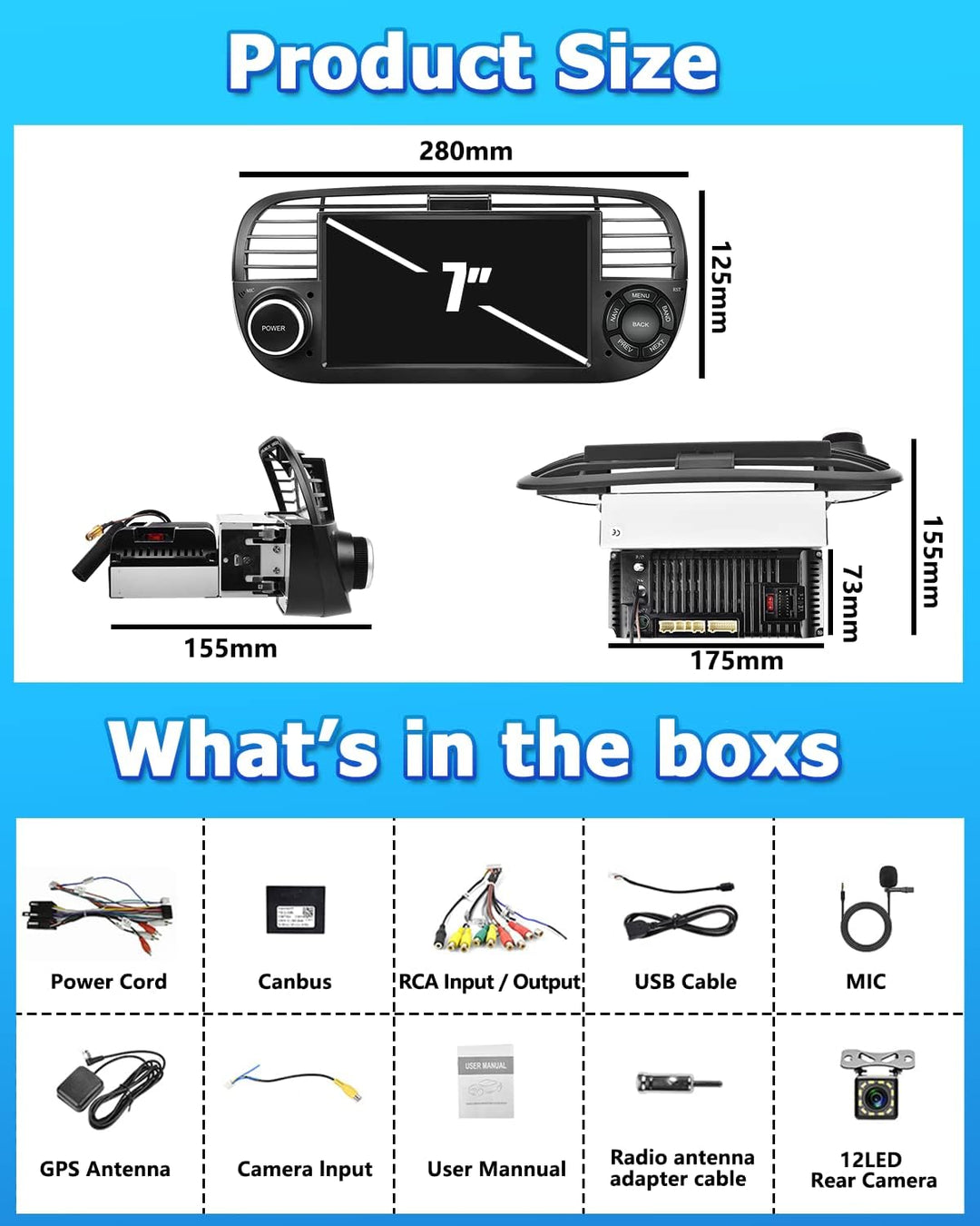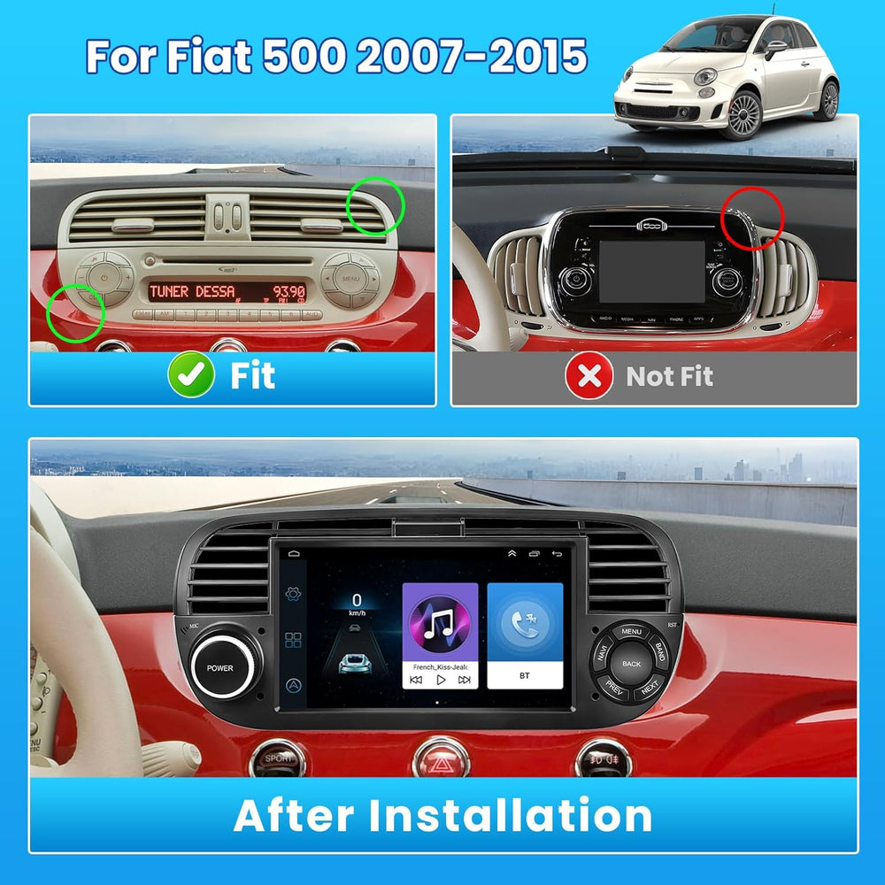 - Android Autoradio für Fiat 500 (2007-2015): Dieses Android Autoradio ist anwendbar auf Fiat 500 2007, 2008, 2009, 2011, 2012, 2013, 2014, 2015. Android Autoradio mit 1GB RAM und 32GB ROM, 7 Zoll kapazitiven Touchscreen Unterstützung Split Screen