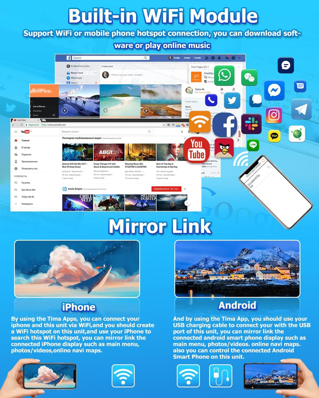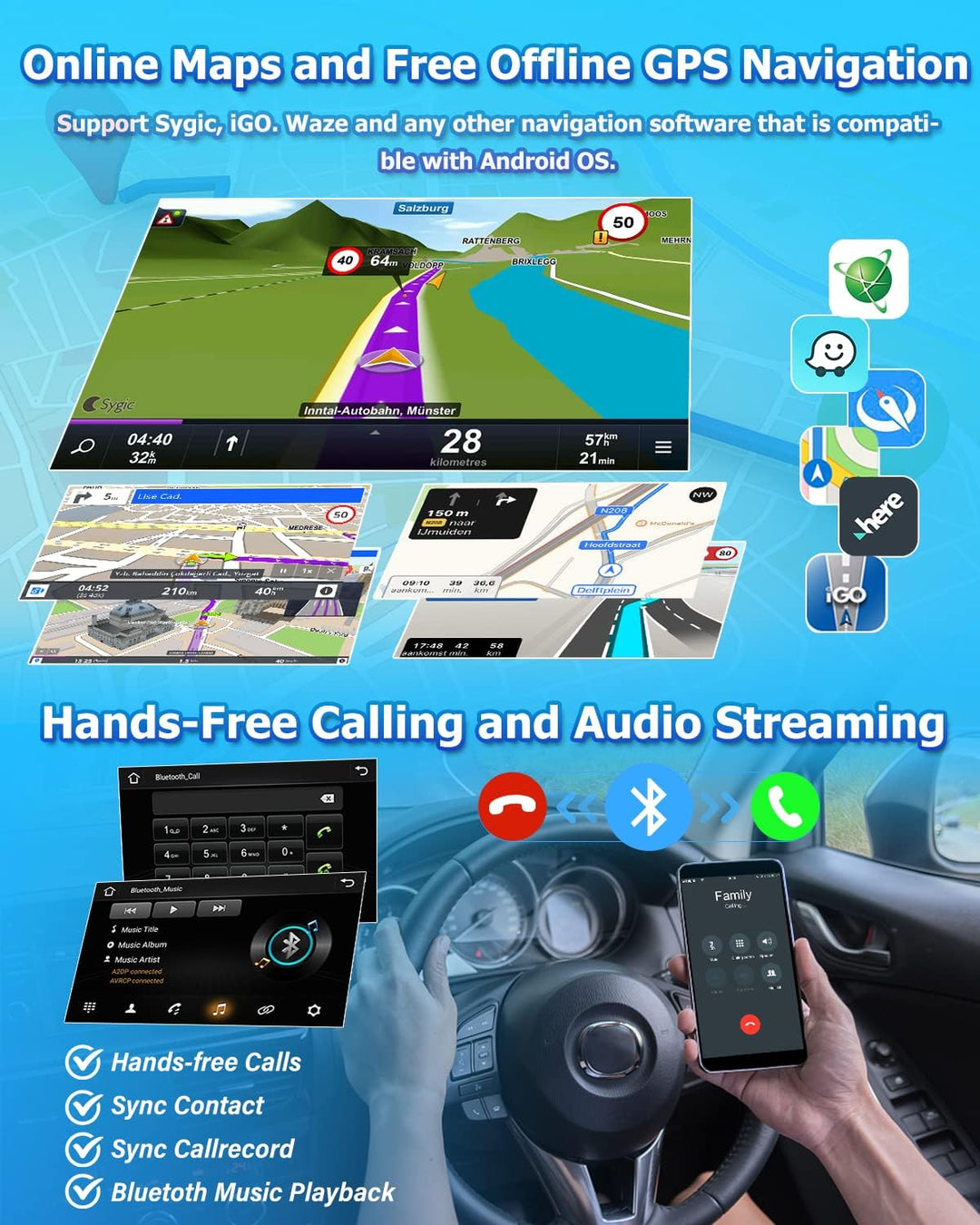 - IOS/Android Bildverbindung: Das Bluetooth Autoradio unterstützt die iOS/Android Bildverbindung. IPhone wird über WiFi verbunden, und Android Telefon wird über WiFi/Original USB Kabel verbunden. Synchronisieren Sie den Bildschirm Ihres Handys einfach