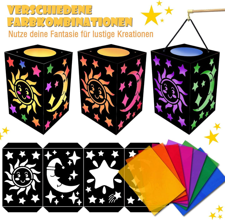 - Einfaches Basteln für Kinder: Unser Laternen Bastelsets Kinder ist sehr einfach zusammenzubauen. Wählen Sie Ihre Lieblingsfarbe des Zellophans, kleben Sie es auf die Innenseite der Laterne, falten Sie die Laterne (wie eine Geschenkverpackung), fügen